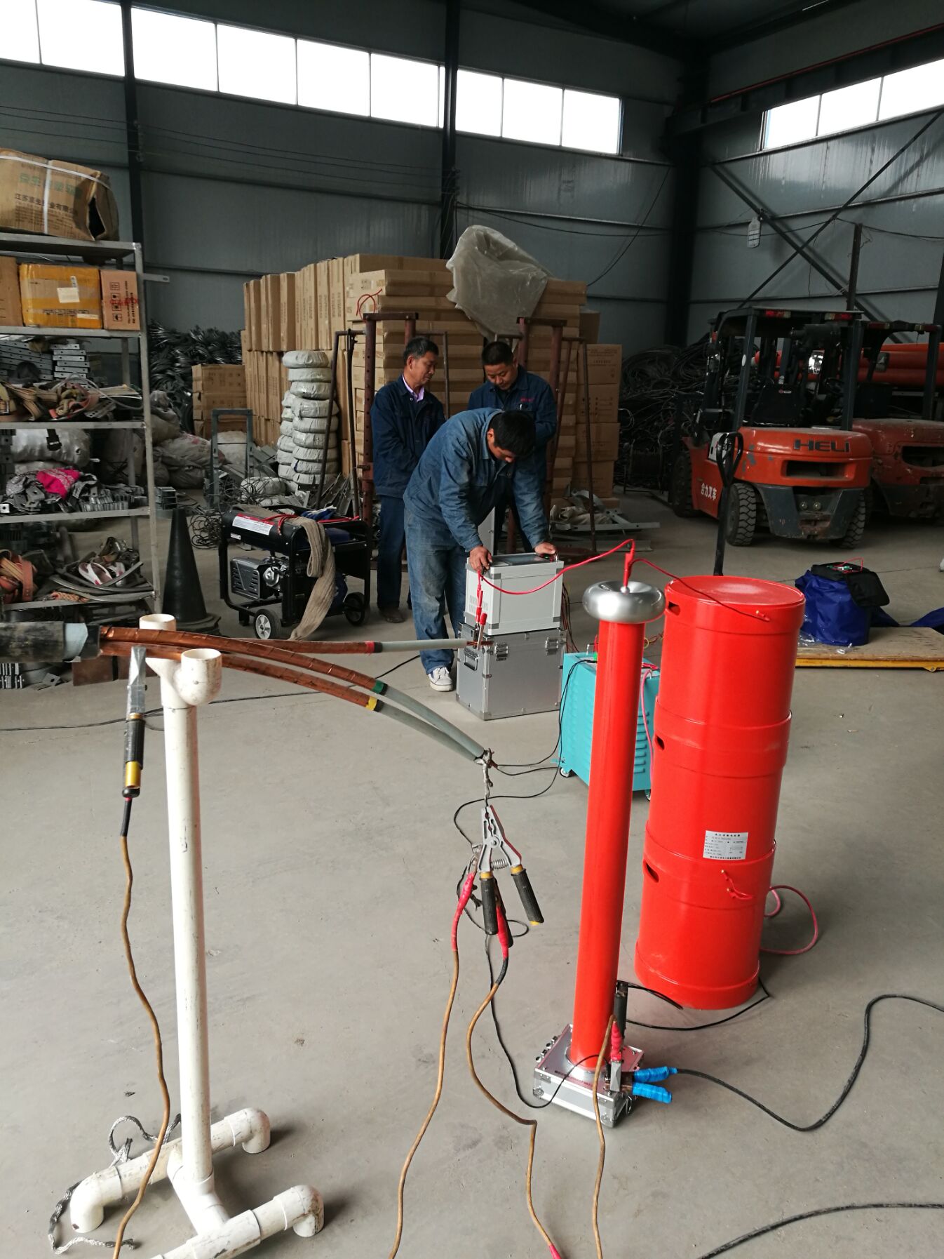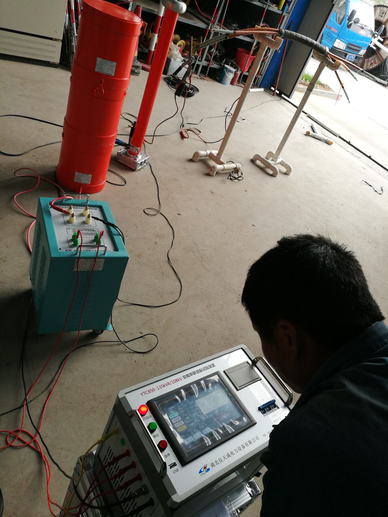 此次培訓(xùn)的設(shè)備和內(nèi)容很多。李工首先對(duì)各項(xiàng)設(shè)備的使用,接線方法進(jìn)行了實(shí)地操作和詳細(xì)的講解,但此次培訓(xùn)的重點(diǎn)是YTC850-135kVA/108kV變頻串聯(lián)諧振試驗(yàn)裝置,該設(shè)備具有流、零位啟動(dòng)、系統(tǒng)失諧(閃絡(luò))等保護(hù)功能,過(guò)壓過(guò)流保護(hù)值可以根據(jù)用戶需要整定,試品閃絡(luò)時(shí)閃絡(luò)保護(hù)動(dòng)作并能記下閃絡(luò)電壓值,以供試驗(yàn)分析。整個(gè)裝置單件重量很輕,便于現(xiàn)場(chǎng)使用。裝置具有三種工作模式:全自動(dòng)模式、手動(dòng)模式、自動(dòng)調(diào)諧手動(dòng)升壓模式,方便用戶根據(jù)現(xiàn)場(chǎng)情況靈活選擇,提高試驗(yàn)速度。