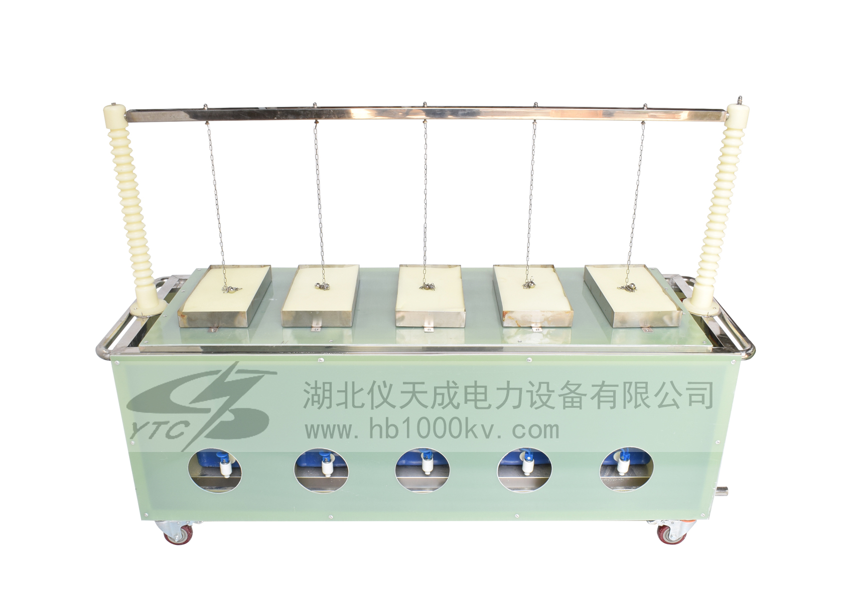 裝置主要特點:可同時測試3雙絕緣靴(手套),并可讀取每只的泄漏電流,準確判斷不合格的絕緣靴(手套);結構底部裝配腳輪,可隨意移動。