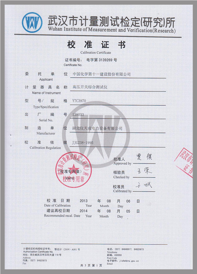 轉載:"YTC3970高壓開關動特性測試儀鑒定證書" 請注明來源于儀天成電力。 更多技術問題請致電儀天成電力客戶服務:027-87876585,技術部專線:027-87876585,在線客服:719388481