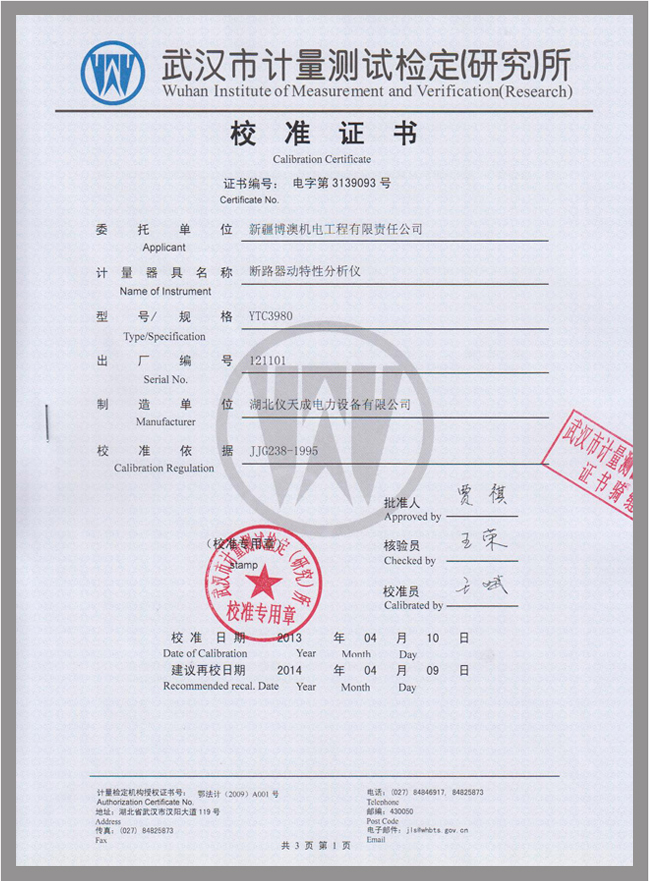 YTC3980斷路器動(dòng)特性分析儀鑒定證書