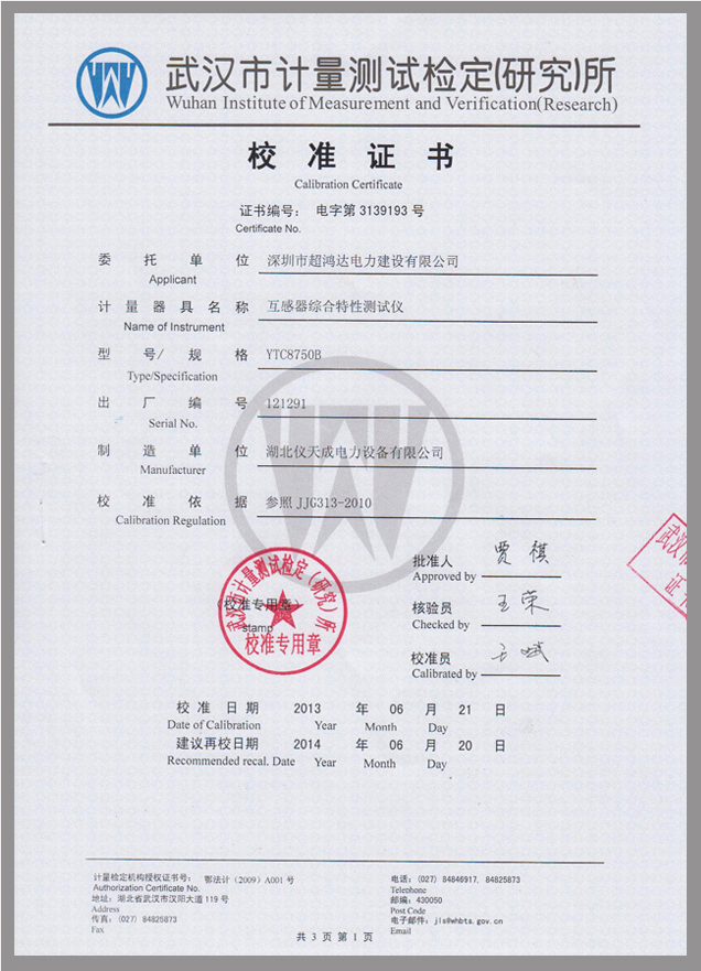 轉(zhuǎn)載:"YTC8750B互感器伏安變比極性綜合測試儀鑒定證書" 請注明來源于儀天成電力。 更多技術(shù)問題請致電儀天成電力客戶服務(wù):027-87876585,技術(shù)部專線:027-87876585,在線客服: